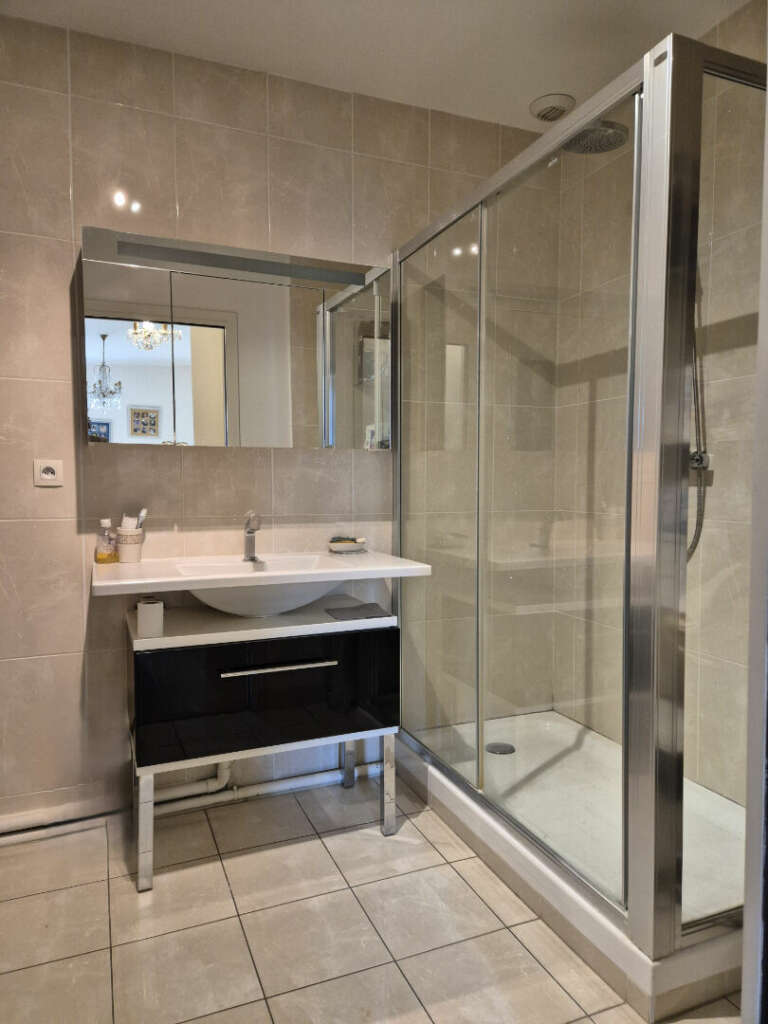 De plus, une chambre, d’une superficie de 13 m², une salle de bain ainsi que des toilettes d’invités avec lave-mains complètent ce bien.