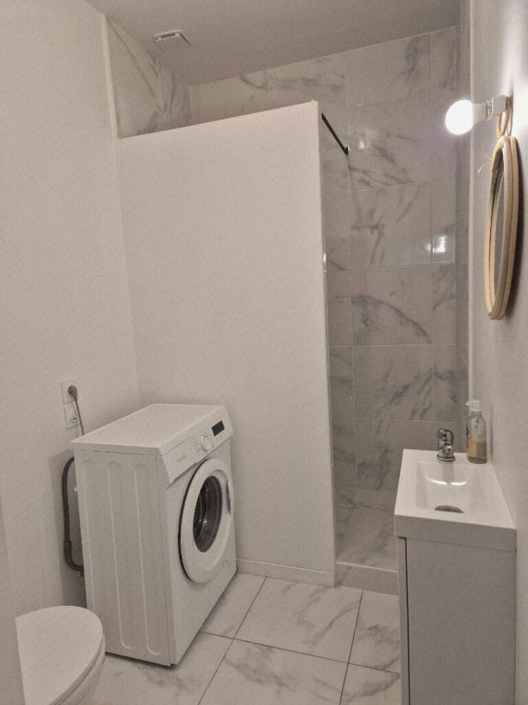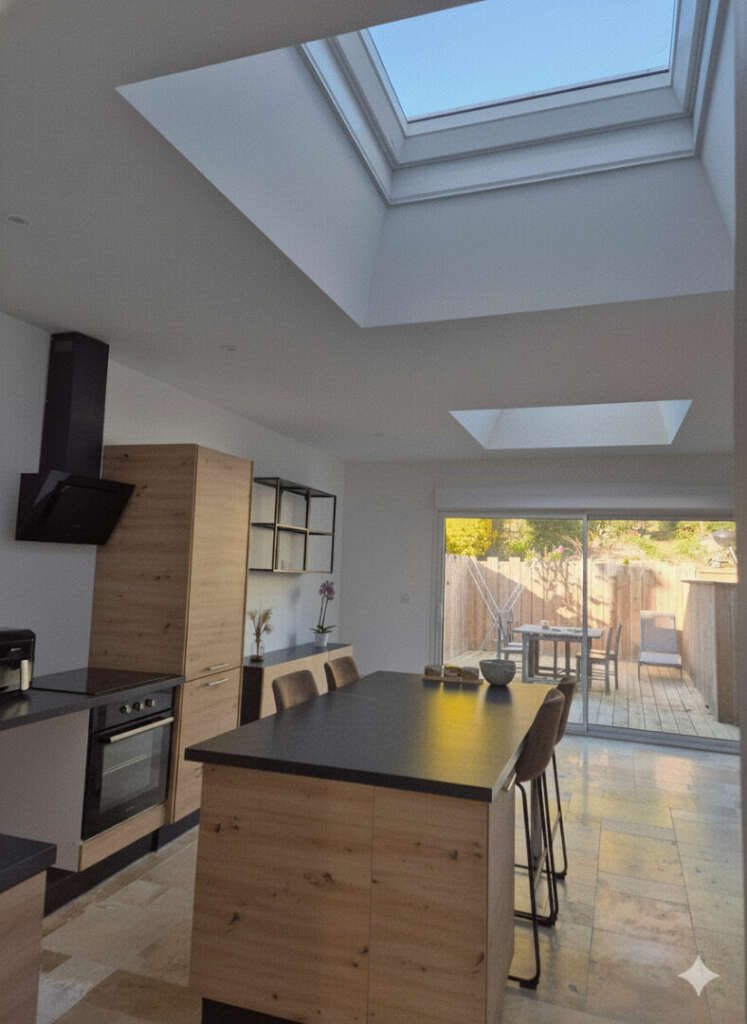 Une salle d’eau + WC au rez-de-chaussée permet d’organiser une un espace nuit supplémentaire .