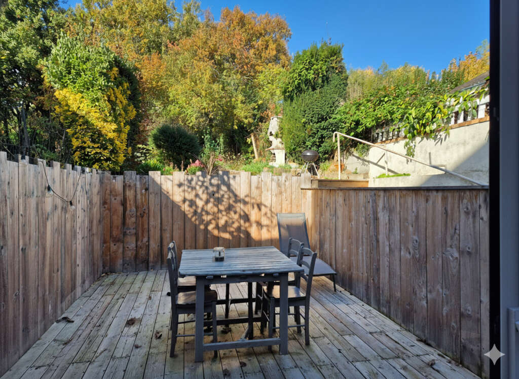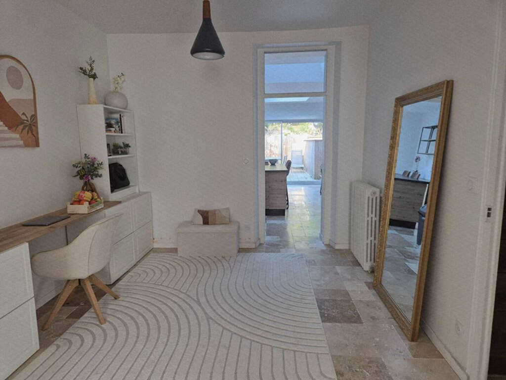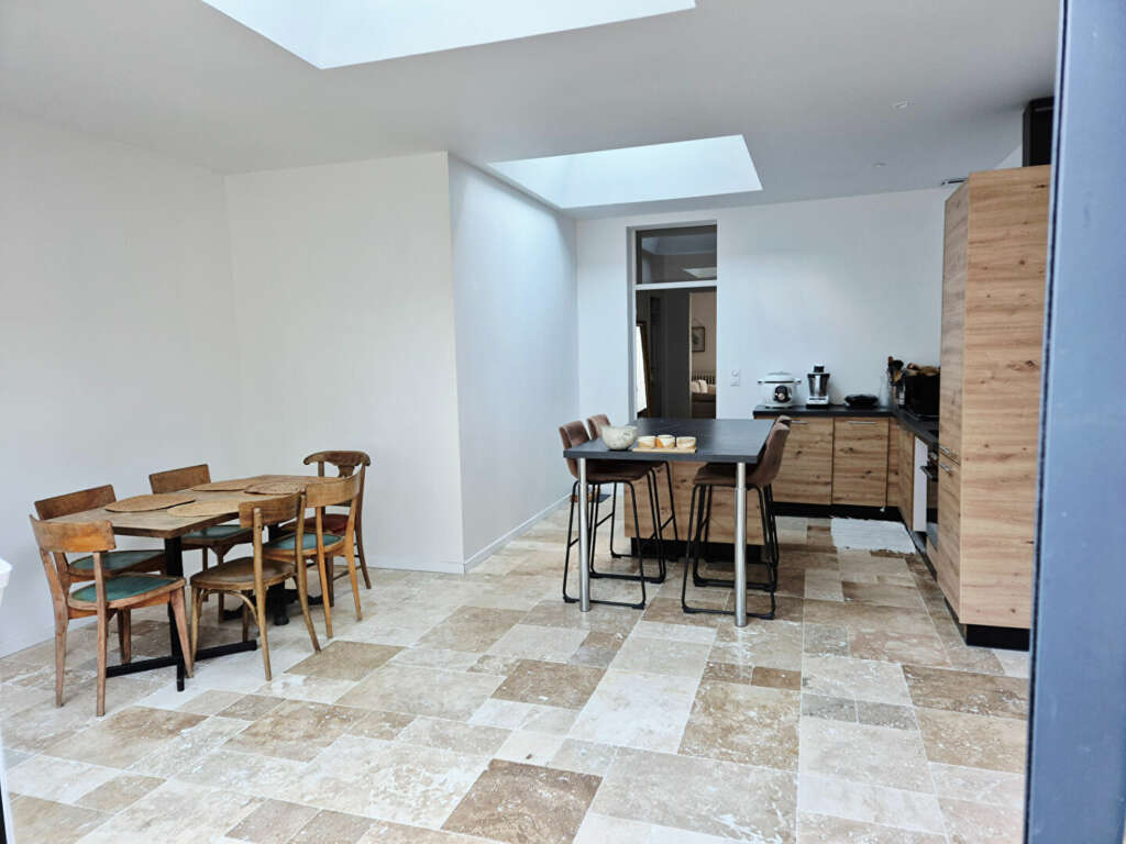 Elle offre 2 espaces salon, une grande cuisine dinatoire donnant accès à une terrasse ainsi qu’un joli jardin ,clos de murs et d’une superficie de 250 m² environ.