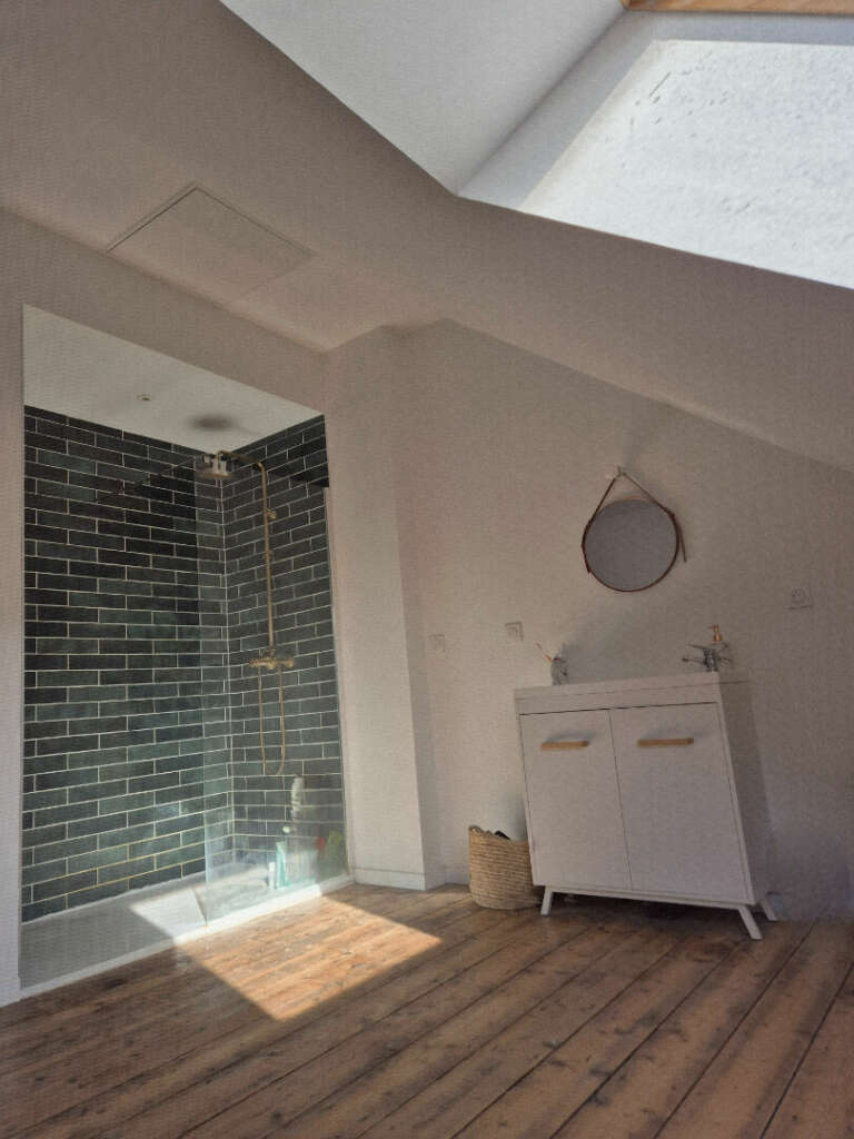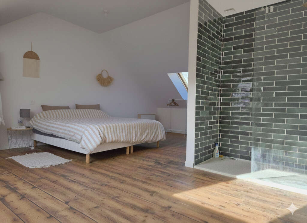 On trouve au 1er étage , 2 chambres , 1 salle de bain ains que des toilettes indépendantes .Au second , une grande chambre avec sa salle d’eau privative.